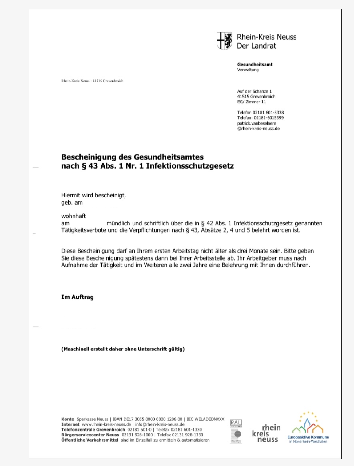 The first issue is an initial instruction. Possible places of issue of the initial instruction are online, the local health department or at officially commissioned doctors. This is an approx. 30-minute long instruction on the ban on activities, infectious diseases and hygiene regulations.